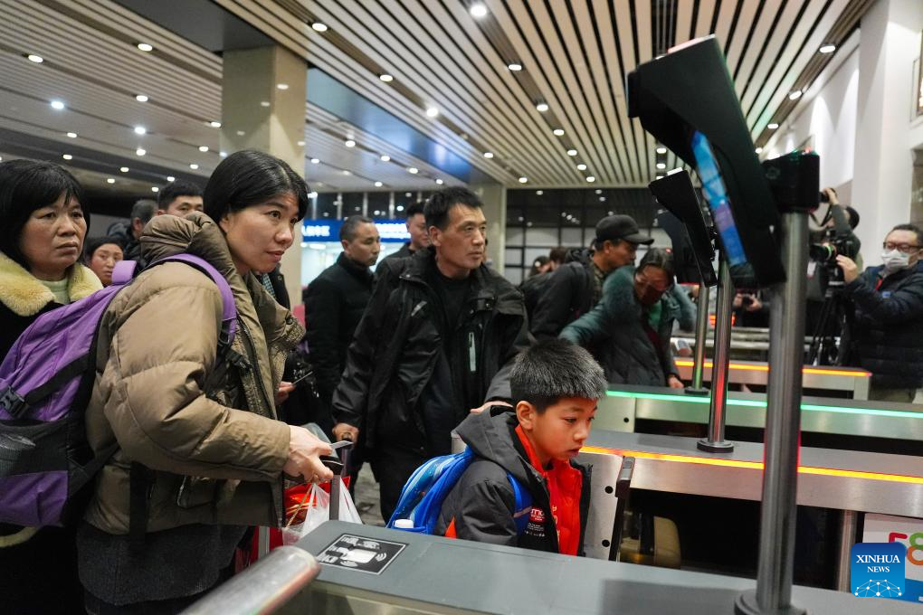 Los pasajeros pasan por las puertas de acceso para subir al tren n.º K4069 en la estación ferroviaria Beijing Oeste, en la capital de China, el 1 de febrero de 2026. (Xinhua/Ju Huanzong).