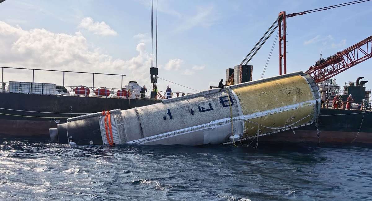 La primera etapa del cohete portador Gran Marcha-10 ha sido sacada y recobrada exitosamente del mar, con lo cual ha finalizado la primera misión de rescate y recuperación marítima de la primera etapa de un cohete por parte de China.