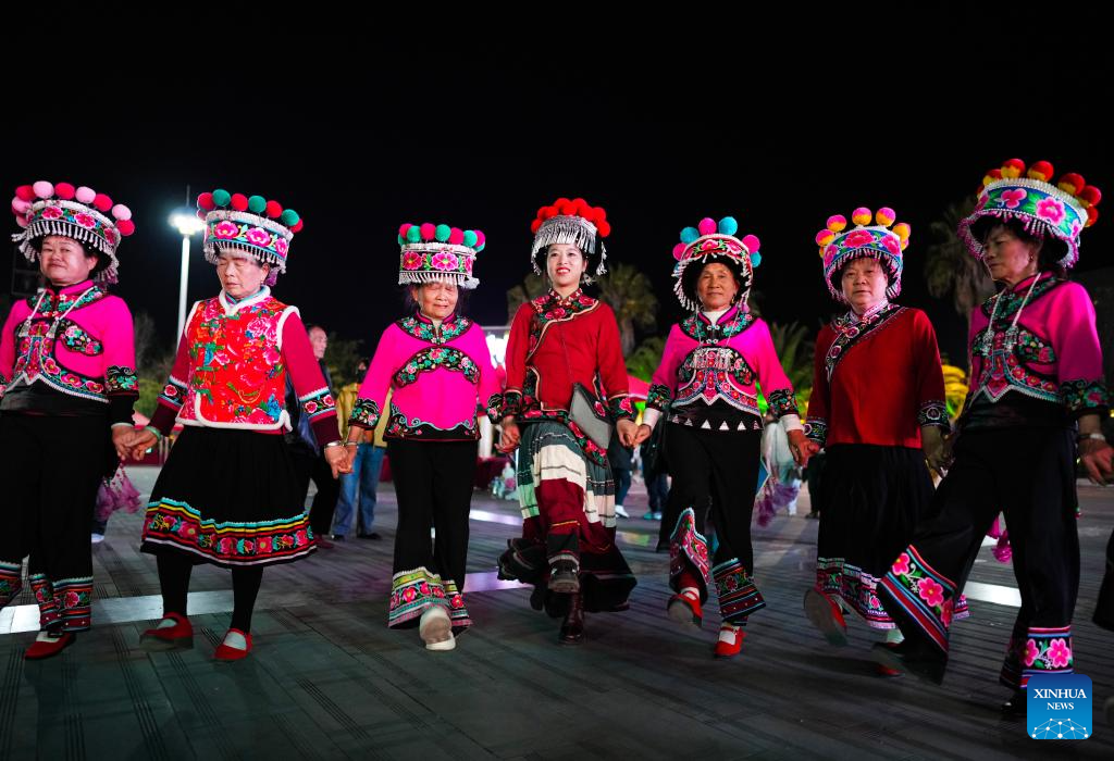 Jin Ruirui (centro) baila con los lugareños en el distrito de Mouding, provincia de Yunnan, suroeste de China, el 9 de febrero de 2026. (Xinhua/Chen Xinbo).