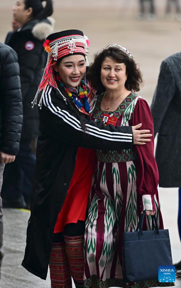 Yang Yuni (izquierda) y Muhtabar Abdolla, miembros del 14.º Comité Nacional de la Conferencia Consultiva Política del Pueblo Chino (CCPPCh), caminan hacia el Gran Palacio del Pueblo para asistir a la reunión inaugural de la cuarta sesión del 14.º Comité Nacional de la CCPPCh en Beijing, capital de China, el 4 de marzo de 2026. (Xinhua/Chen Yehua).