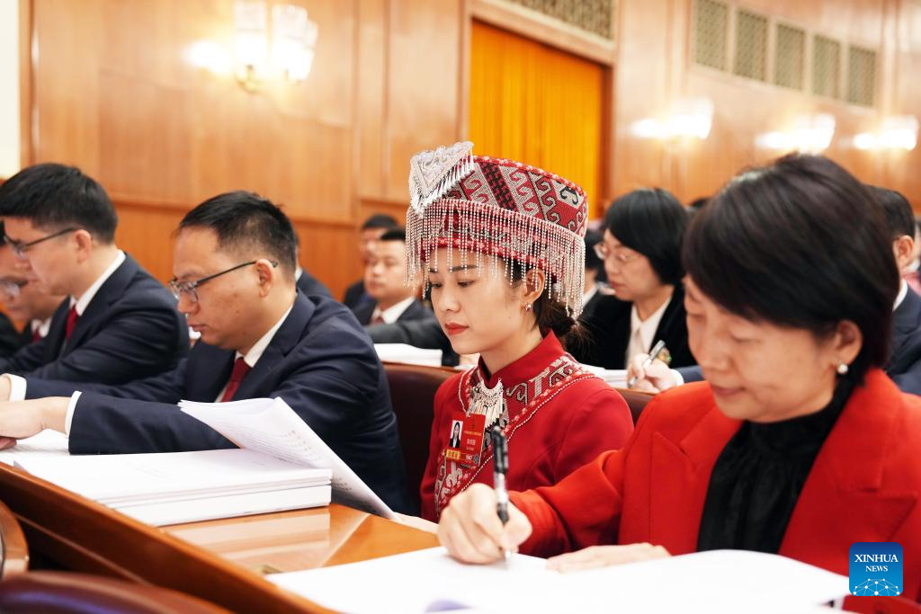 Zhang Qiongli (segunda por la derecha, delante), diputada de la 14.ª Asamblea Popular Nacional (APN), asiste a la reunión inaugural de la cuarta sesión de la 14.ª APN en el Gran Palacio del Pueblo en Beijing, capital de China, el 5 de marzo de 2026. (Xinhua/Xing Guangli).