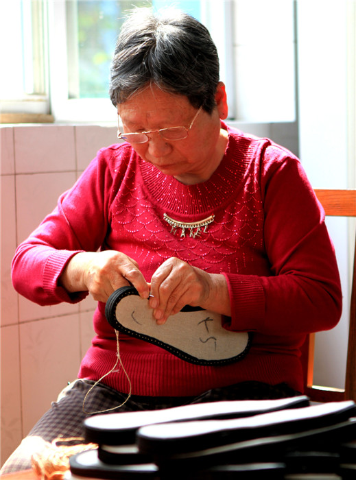 Zapatos hechos a mano.Tomando como referencia esquemas para calzado, estos artesanos cosen calzado con tela. Al acomodar capas de retazos de tela, las suelas quedan lista y sólo hace falta formar el resto de la zapatilla. Suaves y cómodas, los artesanos del calzado son venerados por las viejas generaciones.