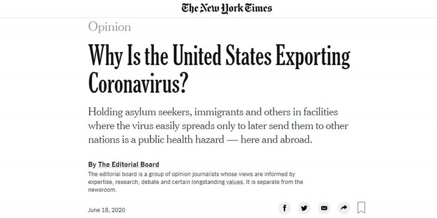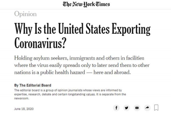 Además de restar importancia a los problemas internos, la administración Trump exporta casos a otros países. Según un editorial del The New York Times el 18 de junio, el país ahora extiende intencionalmente la pandemia fuera de sus fronteras al continuar deportando a miles de inmigrantes, muchos infectados, a países pobres, mal equipados para hacer frente a la enfermedad.