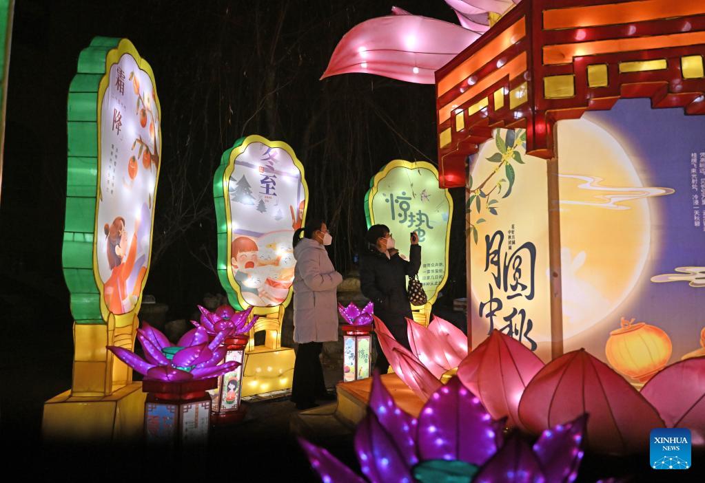Imagen del 26 de enero de 2023 de niños recorriendo un espectáculo de linternas durante las vacaciones del Festival de la Primavera, en Tianjin, en el norte de China. (Xinhua/Zhao Zishuo)