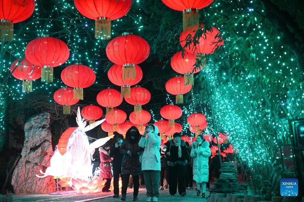 Imagen del 26 de enero de 2023 de personas recorriendo un espectáculo de linternas durante las vacaciones del Festival de la Primavera, en Tianjin, en el norte de China. (Xinhua/Zhao Zishuo)