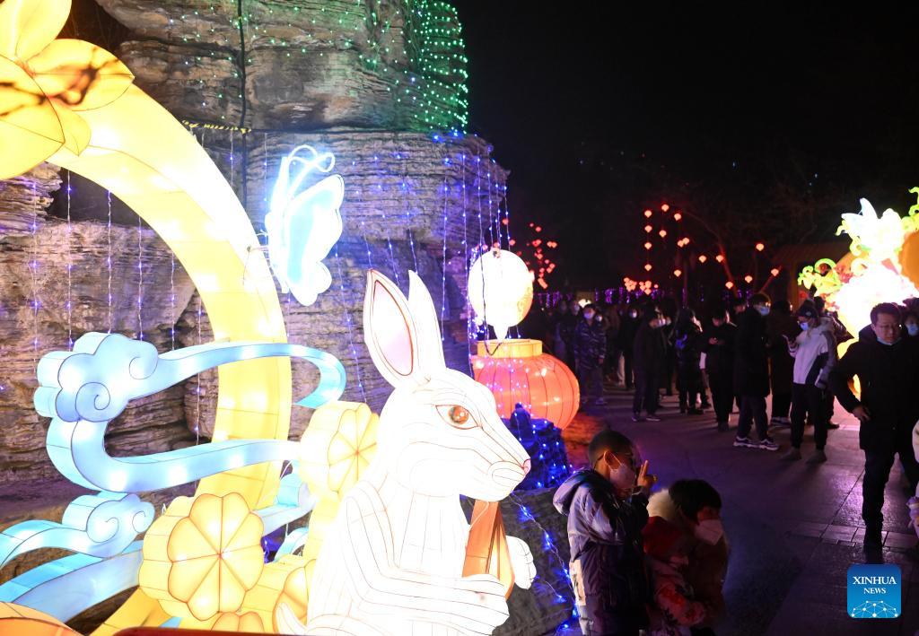 Imagen del 26 de enero de 2023 de personas recorriendo un espectáculo de linternas durante las vacaciones del Festival de la Primavera, en Tianjin, en el norte de China. (Xinhua/Zhao Zishuo)