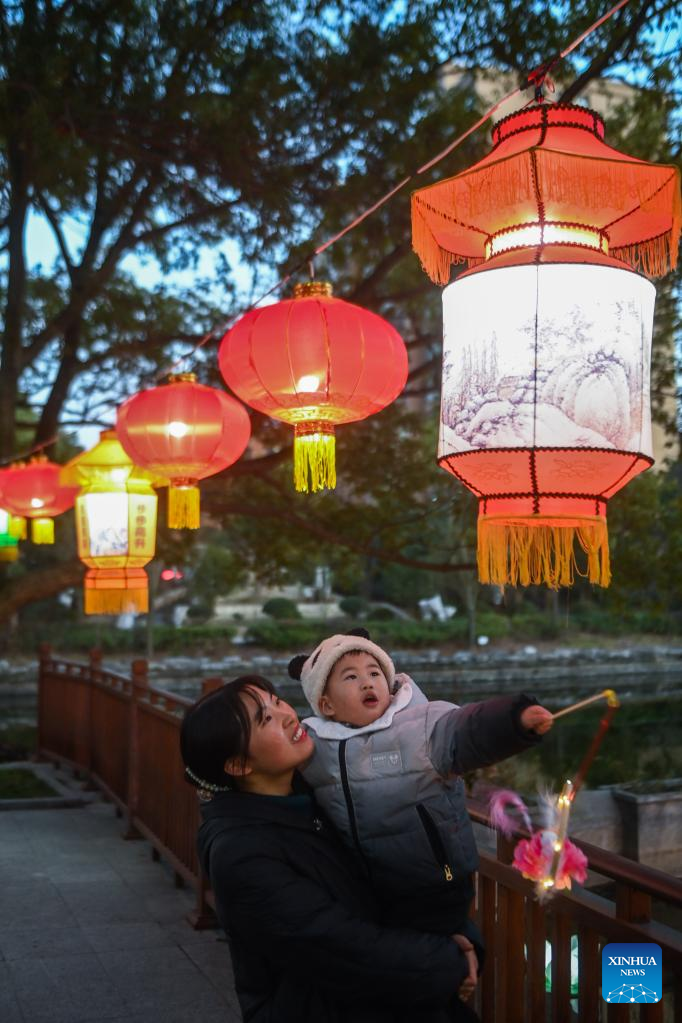 Turistas disfrutan de la Fiesta de los Faroles de Aoshan en el antiguo poblado de Xincheng del distrito de Xiuzhou en Jiaxing, provincia oriental china de Zhejiang, 29 de enero de 2023.