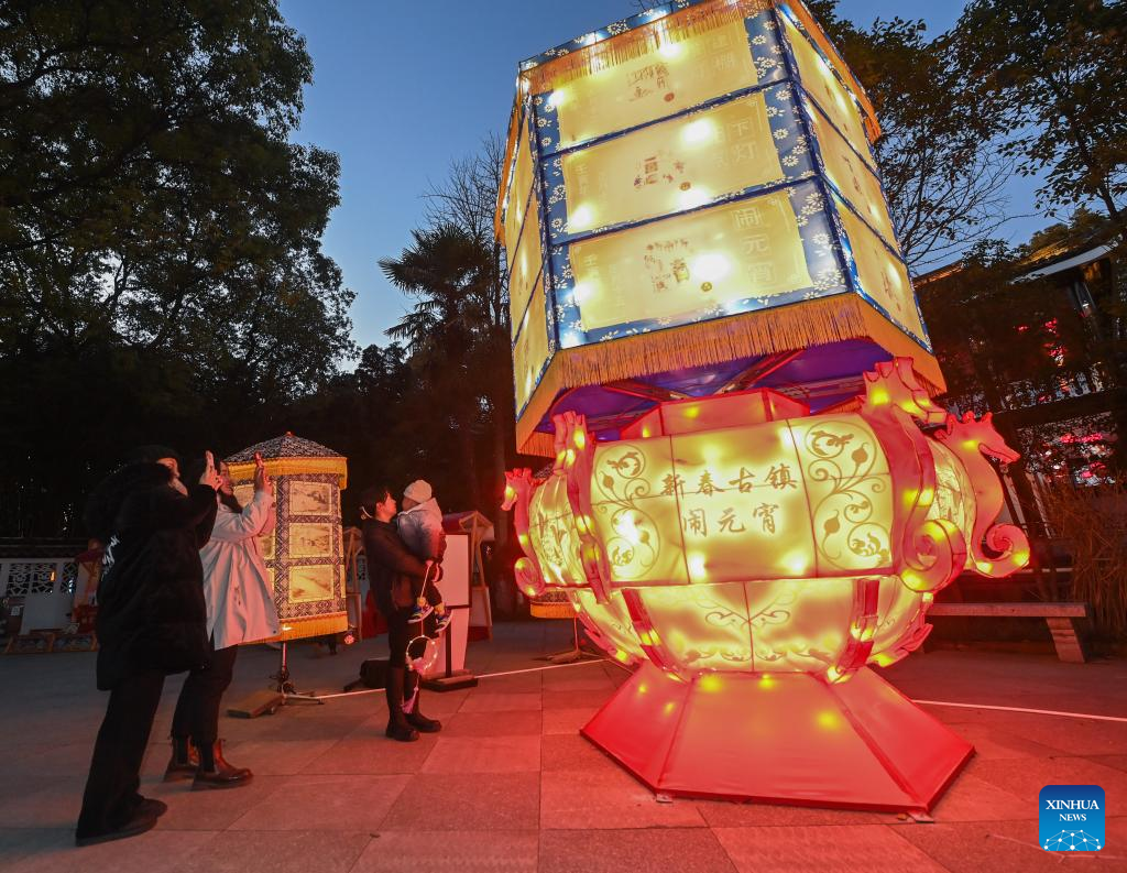 Turistas disfrutan de la Fiesta de los Faroles de Aoshan en el antiguo poblado de Xincheng del distrito de Xiuzhou en Jiaxing, provincia oriental china de Zhejiang, 29 de enero de 2023.