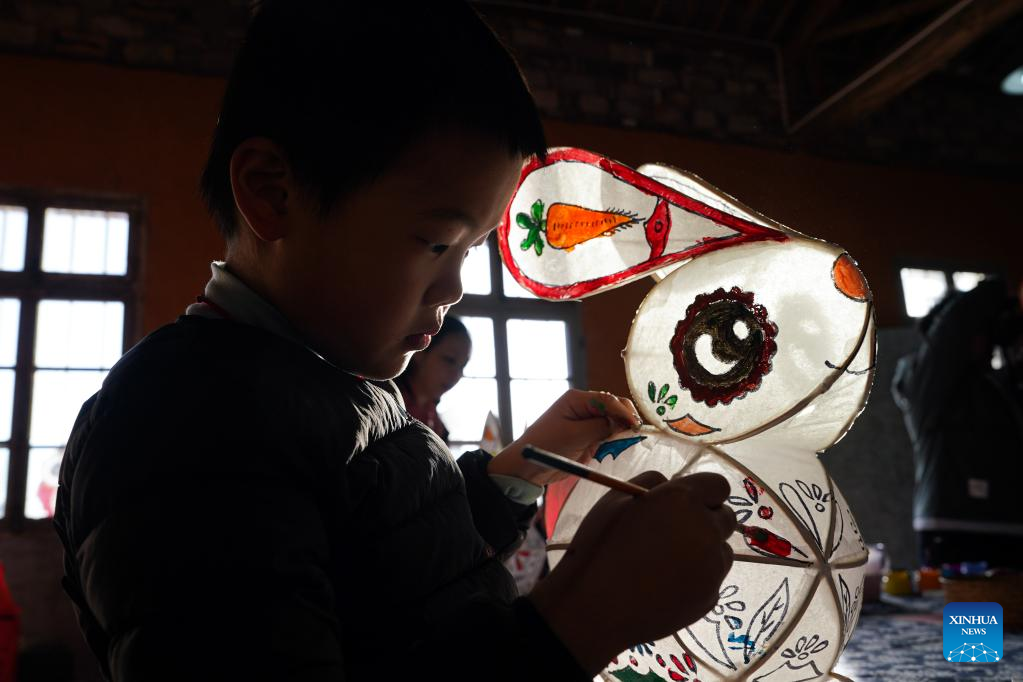 Visitantes aprenden a confeccionar faroles en forma de conejo en la aldea Hongcun del distrito de Yixian, provincia oriental china de Anhui, 30 de enero de 2023.
