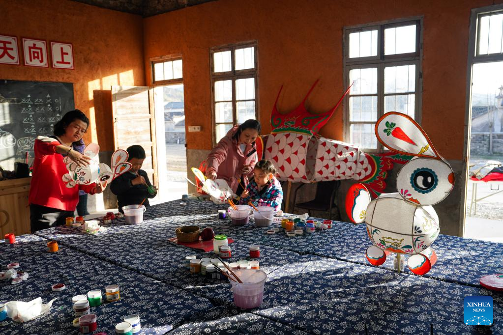 Visitantes aprenden a confeccionar faroles en forma de conejo en la aldea Hongcun del distrito de Yixian, provincia oriental china de Anhui, 30 de enero de 2023.