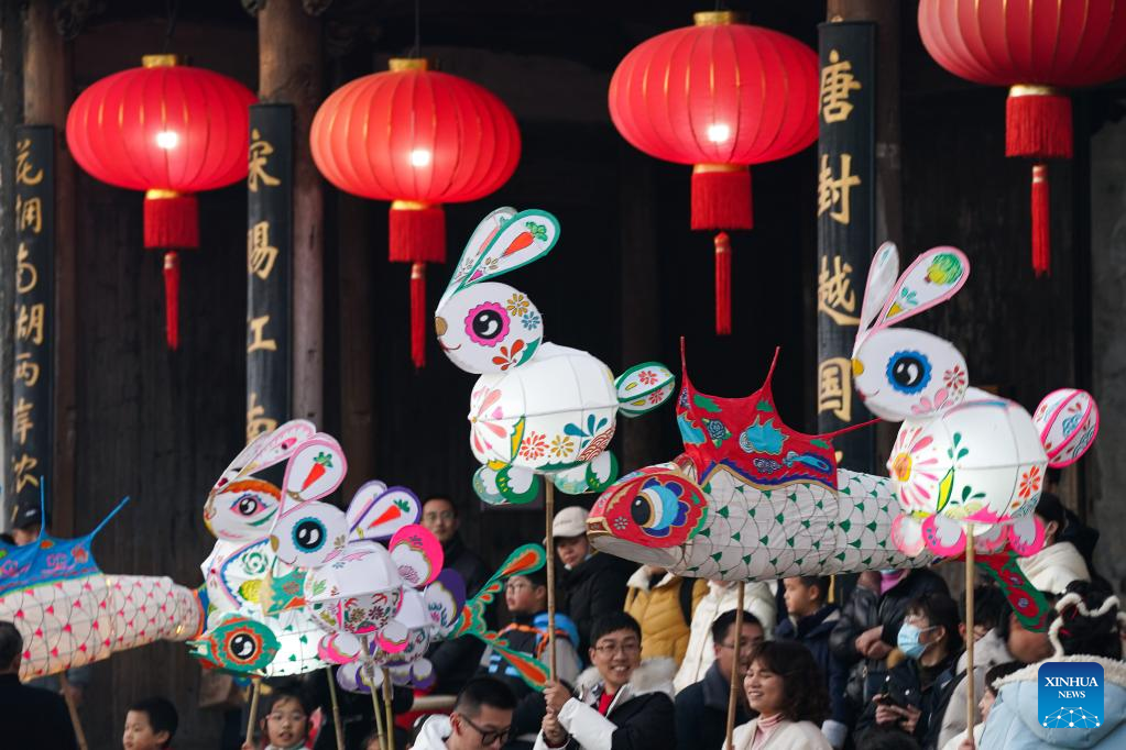 Turistas sostienen faroles en forma de conejo en la aldea Hongcun del distrito de Yixian, provincia oriental china de Anhui, 30 de enero de 2023.