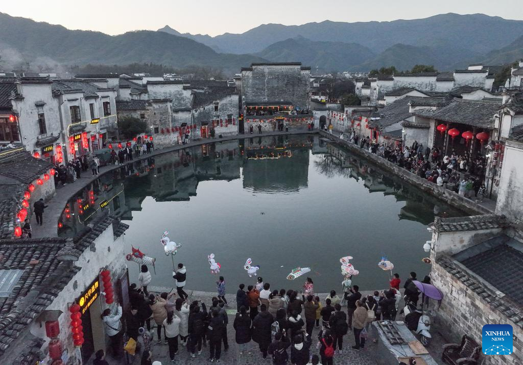 Los turistas participan en un desfile temático para celebrar el Año Nuevo Chino en la aldea Hongcun del distrito de Yixian, provincia oriental china de Anhui.
