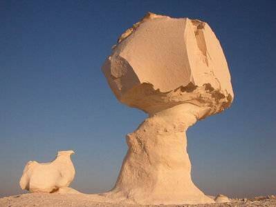 Esta roca en Egipto es una de las rocas en forma de seta más famosas del planeta. Ha experimentado una grave erosión y meteorización. Las rocas en forma de hongo aparecen generalmente en las zonas desérticas y se forman al sufrir las rocas una meteorización y erosión más fuerte en su base que en su parte superior durante miles de años.