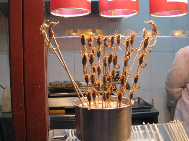 ¿Qué tal los escorpiones en un pincho? ¿Es esto un bocadillo diario, o un poco extraño y repulsivo? Vi un puesto vendiéndolos en Beijing. Creo que podría haber escogido una brocheta de escorpiones menéandose y me los habrían freído allí mismo. No vi que nadie los pidiera. Así que no sé cómo exactamente se realiza el procedimiento.