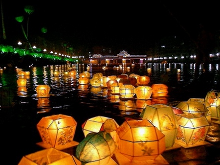 Las personas creen que deben colgarse lámparas para celebrar a los fantasmas. Los seres humanos y las tierras pertenecen al Yang, que significa positivo, mientras que los fantasmas y el agua pertenecen al Yin, que significa negativo. La obscuridad y el misterioso inframundo regularmente recuerdan a las personas sobre el sufrimiento de las almas en el infierno sepulcral. Y las lámparas son colocadas sobre el agua para que floten.