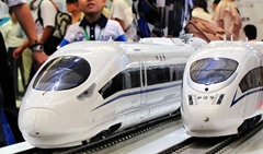 Los visitantes miran los modelos de trenes de alta velocidad en una exhibición en Shanghái, 23 de agosto de 2011.
