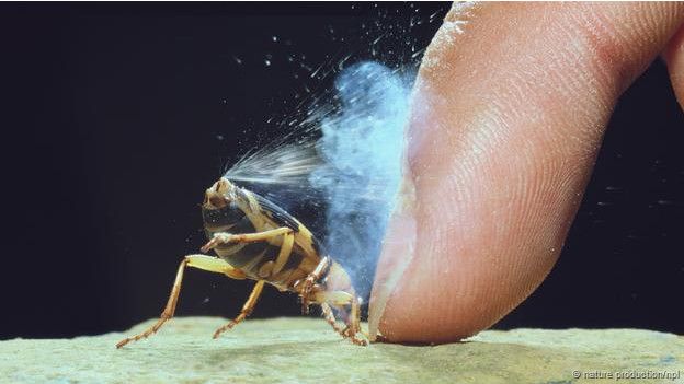 Algo parecido hace el escarabajo bombardero, que lanza un líquido desde la punta de su abdomen. Almacena hidroquinona y peróxido de hidrógeno en cavidades independientes, que al juntarse generan una reacción química que calienta la sustancia hasta casi 100ºC, que resulta letal para otros insectos.