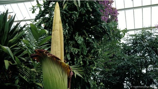 La enorme Amorphophallus Titanium produce un enorme racimo de flores que se eleva a tres metros sobre el suelo. Es originaria de Sumatra y rara vez florece, pero cuando lo hace despide un fuerte olor a carne descompuesta que es irresistible para las abejas, moscas y escarabajos carroñeros.