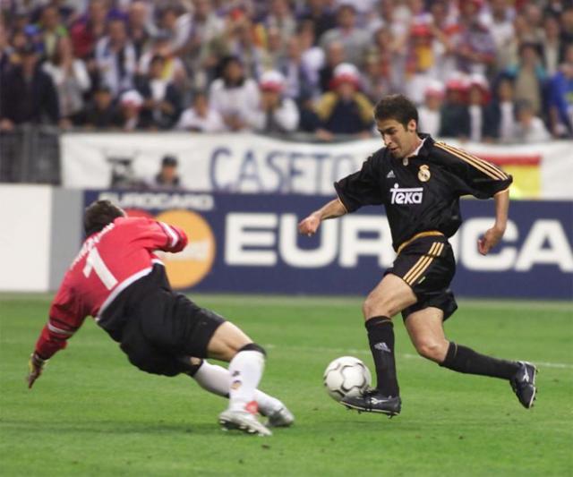 11. Fue la segunda Champions de Raúl, contra el Valencia de su amigo Cañizares. El gol de la imagen, el 3-0, fue de leyenda. Se lo dedicó a su hijo Jorge después de recorrer medio campo con el cuero pisado al pie, driblar a Cañete y marcar con la derecha.