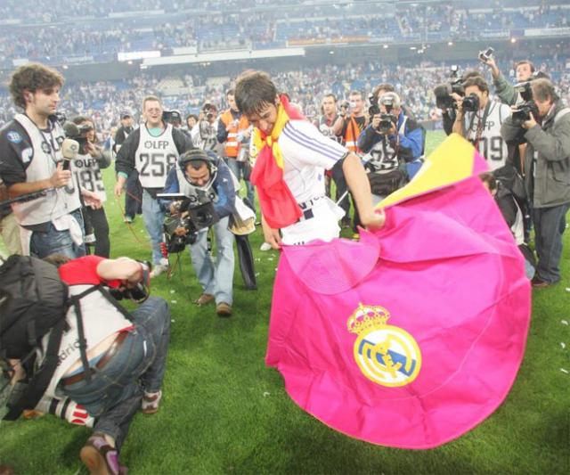 13. Raúl celebró la ''Liga de las Remontadas'' con su capote, el de siempre. Fue una tradición. Ganaba el Madrid y el ''7'' se ponía delante del toro.