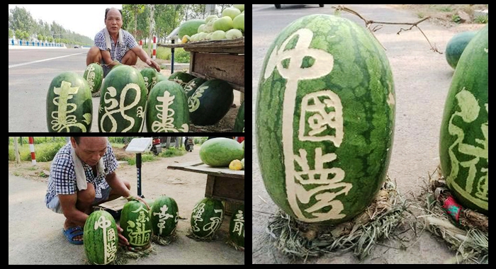 El agricultor Gu Xinliang, de 56 años, de la provincia central de Henan, dijo que nunca imaginó que sus sandías talladas llegarían a ser tan populares que vendería 3.000 kg en tan sólo 11 días. Gu involuntariamente talló caracteres chinos en sus sandías tras una temporada de difíciles ventas. Poco sabía entonces que en tan sólo 11 días, vendería más de 3.000 kg de sandías, junto con casi 2.000 kg de melones.