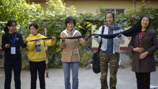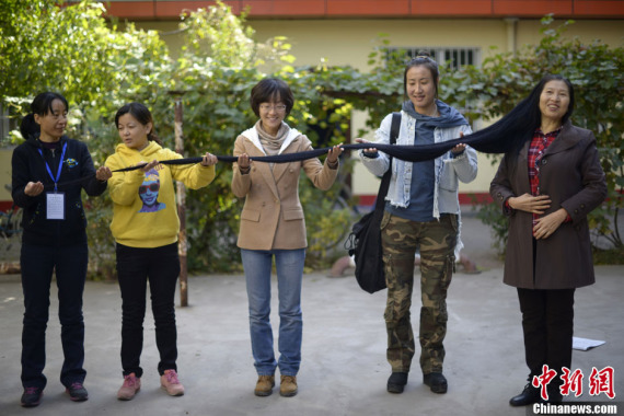 Ni Linmei (der) muestra su cabello de 2,9 metros de largo en aquella época con la ayuda de sus amigas, octubre de 2013 (Photo: China News Service/)