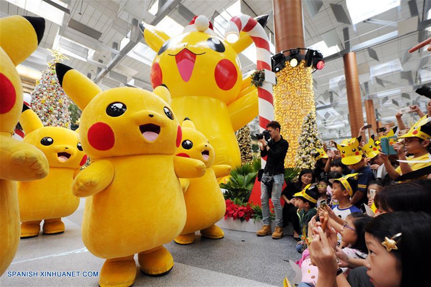Un grupo de "Pikachus" baila para el público en el Aeropuerto Changi de la ciudad de Singapur, capital de Singapur, el 18 de noviembre de 2016. El Aeropuerto Changi de Singapur realizó un "Desfile de Pikachu" en la Terminal 3 el viernes. (Xinhua/Then Chih Wey)
