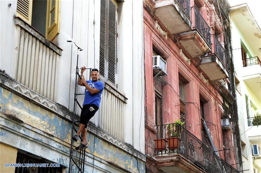 Imagen del 11 de noviembre de 2017, de Félix Guirola subiendo a su bicicleta frente a su casa en la Habana Vieja, La Habana, Cuba. El cubano Félix Guirola no le teme a las alturas, por eso anda por las calles de La Habana sobre una singular bicicleta de casi cuatro metros de altura. Guirola ha remodelado varias bicicletas desde aquel 14 de agosto de 1981, cuando con una de casi dos metros se convirtió en la principal atracción de los carnavales de la central ciudad cubana de Ciego de Ávila, donde nació hace 52 años. El día antes había visto por primera vez en su vida un tándem que trató infructuosamente de comprar, y ante la frustración decidió construir su propio modelo, pero muy diferente, porque en vez de crecer en longitud, aumentó poco a poco en altura. Guirola asegura que en aquellos años tuvo el récord mundial de la bicicleta más alta desde 1987 hasta 2004, pero nadie se enteró, pues solo conocían de sus hazañas los vecinos de Ciego de Ávila. Desde hace siete años, en noviembre de 2010, Guirola se mudó a La Habana, donde vive en los bajos de un viejo edificio "art decó", en el cual tiene un pequeño taller donde trabaja con hierros y partes de bicicletas, fundamentalmente de fabricación china, de las marcas Flying Pigeon y Forever. En la capital de la isla, superar el récord Guinness se convirtió en una verdadera obsesión, y con un ciclo de 7.3 metros llegó a superar al estadounidense Richie Trimble, que tenía una marca de 6.15 metros. En un desafío a las leyes de la física, Guirola dice que el único límite que tiene son los materiales, y asegura que "no tendría limitaciones de altura si tuviera la posibilidad de tener los materiales necesarios, que no fueran tan pesados".