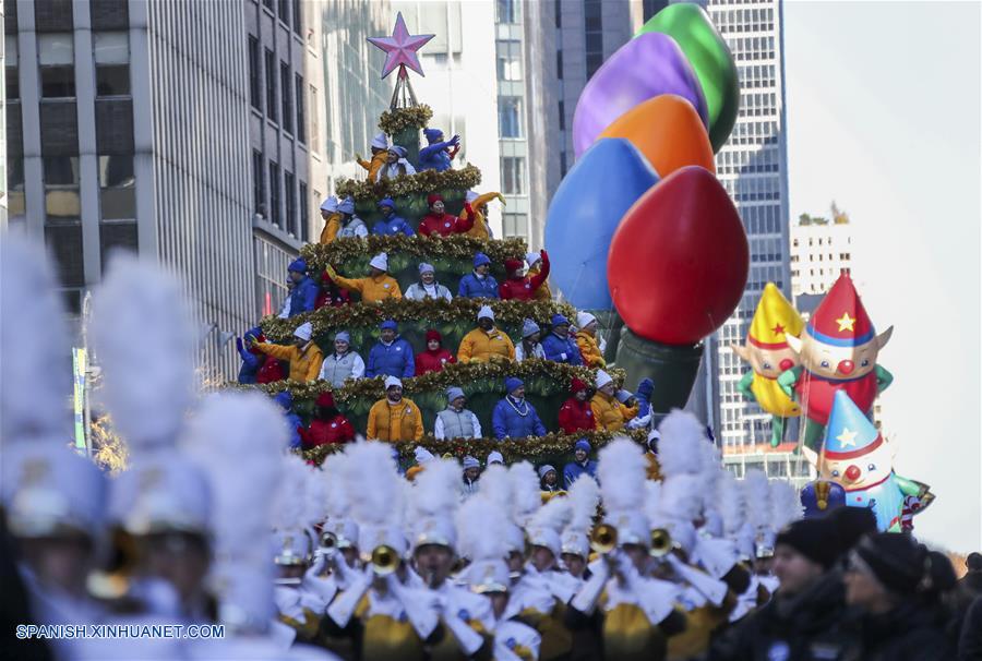 Personas observan el carro alegórico del Arbol Cantante de Navidad de la tienda Macy's durante el Desfile del Día de Acción de Gracias 2017 de Macy's, en Nueva York, Estados Unidos, el 23 de noviembre de 2017.