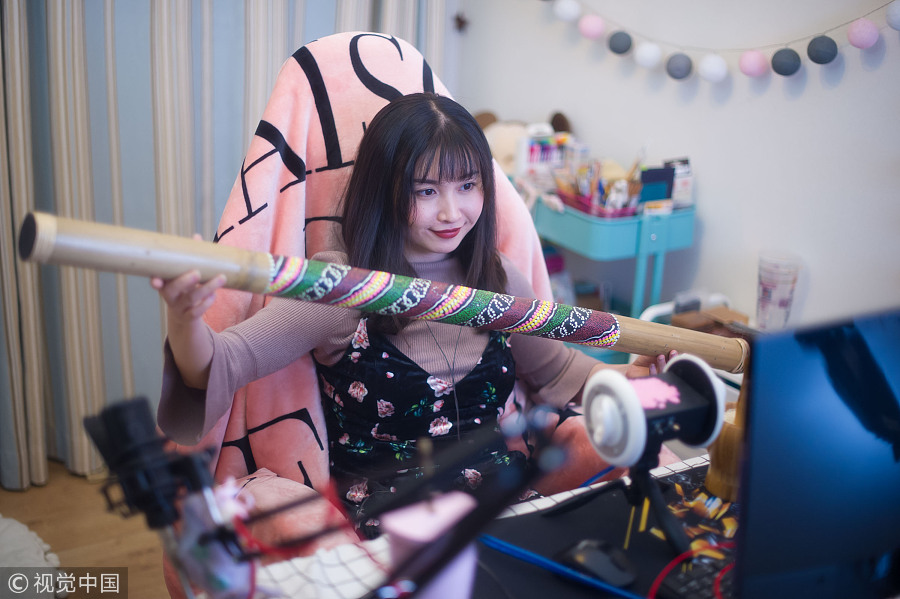 La presentadora de videos en tiempo real de ASMR, Xiu Weiya, utiliza un tubo hueco para simular el sonido de la lluvia en Guangzhou, provincia de Guangdong, el 4 de noviembre de 2017.