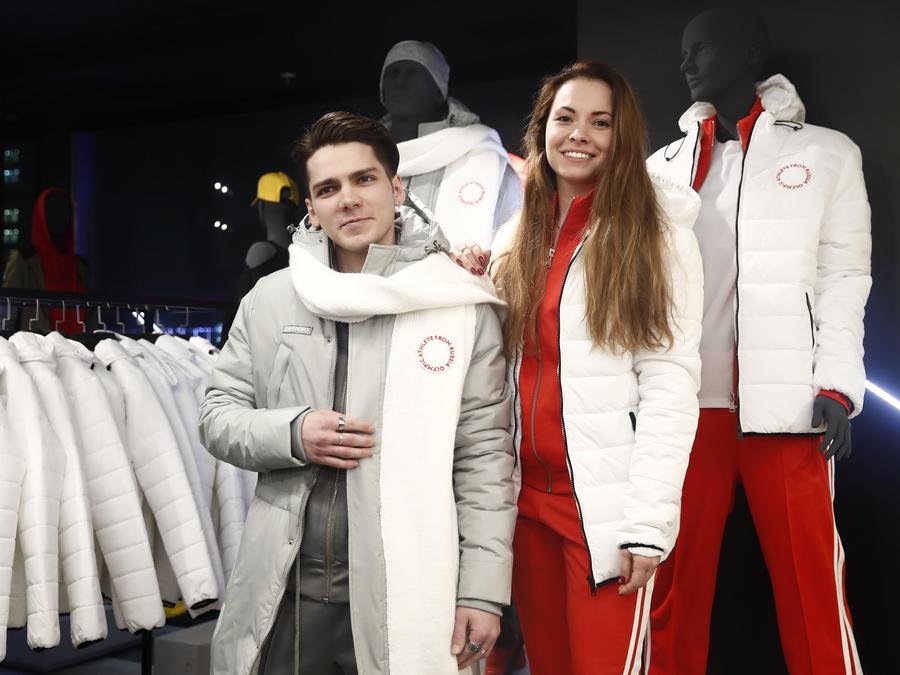 Los patinadores rusos Denis Airapetyan y Emina Malagich visten el uniforme diseñado por ZASPORT, el proveedor oficial de los deportistas rusos en los Juegos Olímpicos 2018, mientras posan en la presentación en Moscú, el 22 de enero de 2018.