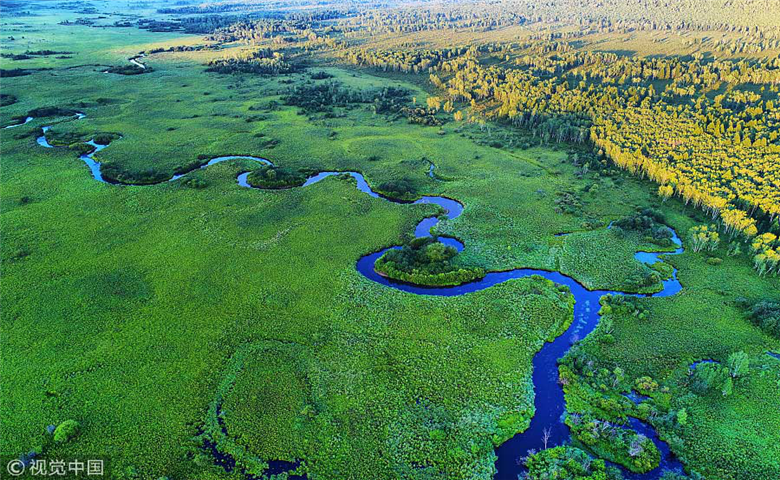 Una vista aérea de la marisma cubierta de hierba en el norte de Hulun Buir de la región autónoma de Mongolia Interior, el 2 de agosto de 2017.