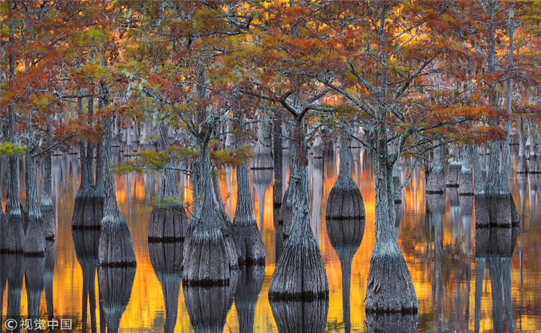 El bosque reflejado en el agua de las tierras pantanosas de Okefenokee, en el sur de Georgia, Estados Unidos, el 25 de octubre de 2017.