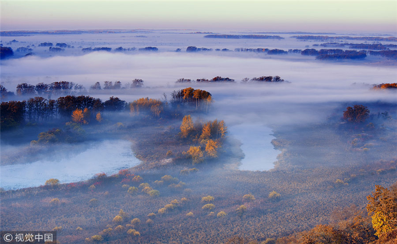 El sol de la mañana brilla en los humedales brumosos de la isla de Zhenbao en Hulin, provincia de Heilongjiang, el 10 de octubre de 2010.