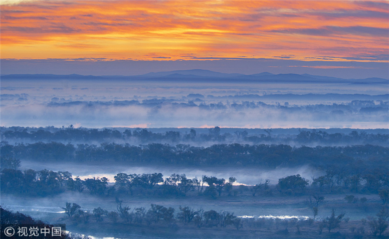 El sol de la mañana brilla en los humedales brumosos de la isla de Zhenbao en Hulin, provincia de Heilongjiang.