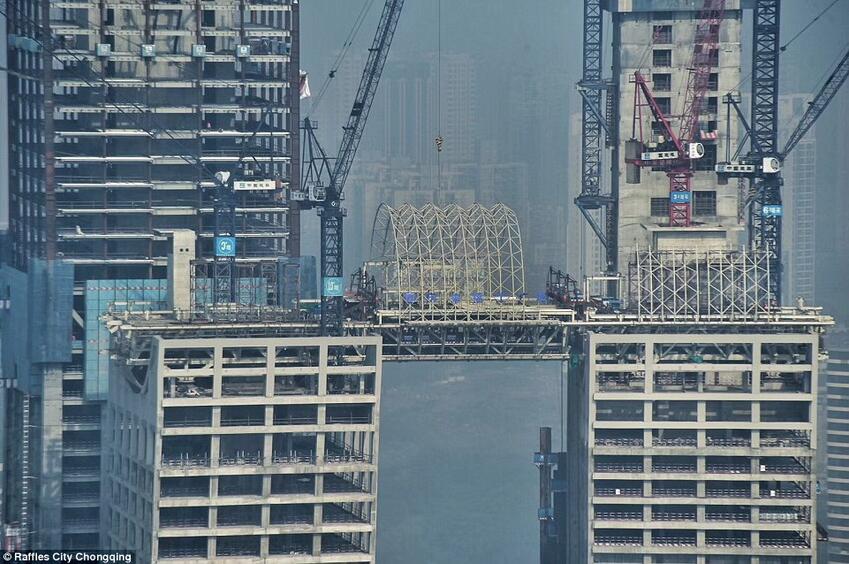 ¡Es un “rascacielos horizontal”! Trabajadores chinos construyen un enorme corredor de vidrio sobre cuatro torres de 60 pisos