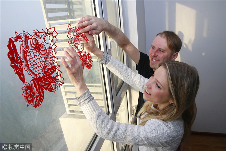 Una pareja pegando decoraciones en una ventana durante el Festival de Primavera Chino en Tianjin, 23 de febrero de 2018.