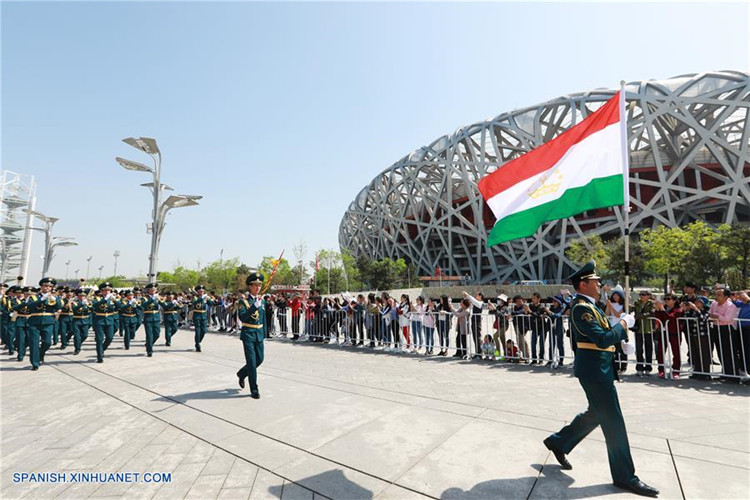 Integrantes de banda militar de Tayikistán participan en un desfile de bandas militares llevado a cabo en el Parque Olímpico de Beijing, durante un festival de bandas militares de la Organización de Cooperación de Shanghai (OCS), en Beijing, capital de China, el 25 de abril de 2018. Bandas militares de China, Kirguizistán, Pakistán, Rusia, Tayikistán, Uzbekistán, India y Bielorrusia, participaron en el quinto festival de bandas militares de la OCS.