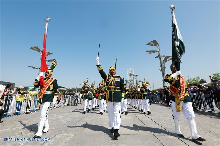 Integrantes de la banda militar de Pakistán participan en un desfile de bandas militares llevado a cabo en el Parque Olímpico de Beijing, durante un festival de bandas militares de la Organización de Cooperación de Shanghai (OCS), en Beijing, capital de China, el 25 de abril de 2018. Bandas militares de China, Kirguizistán, Pakistán, Rusia, Tayikistán, Uzbekistán, India y Bielorrusia, participaron en el quinto festival de bandas militares de la OCS.