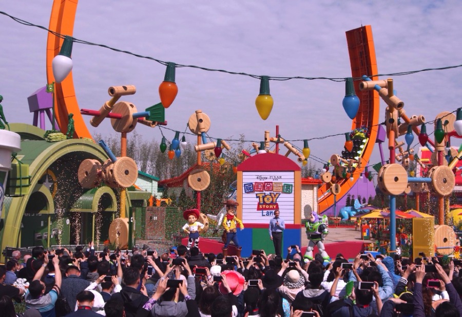 Ceremonia de apertura de la sección Toy Story de Pizar en Disneyland Shanghai, China, el 26 de abril de 2018. La zona abrió sus puertas el jueves en el parque de atracciones de Disney en Shanghai, en lo que sería la primera ampliación de la franquicia desde su debut en 2016. Toy Story Land, la séptima área temática en el recinto, se basa en la popular producción del mismo nombre de Disney Pixar. [Photo/Xinhua]