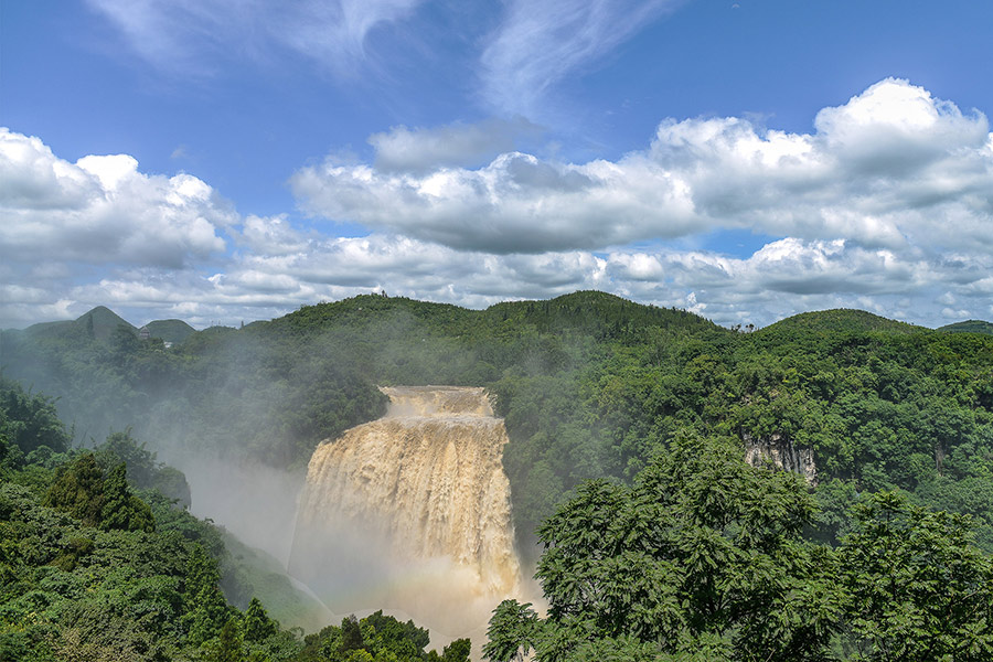 Fotografía tomada el 20 de junio de 2018  que revela la cascada Huangguoshu en Anshun, provincia de Guizhou, suroeste de China. Debido a las continuas lluvias, la cascada Huangguoshu vivió este miércoles su máximo torrente de la temporada de inundaciones de este año, con un caudal de 395 metros cúbicos por segundo.