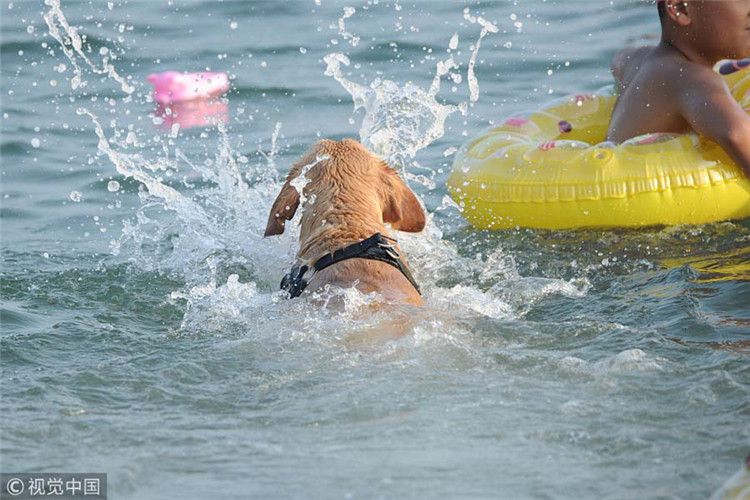 Un perro jugando en agua en Dalian, provincia de Liaoning, noreste de China,el 2 de agosto de 2018.
