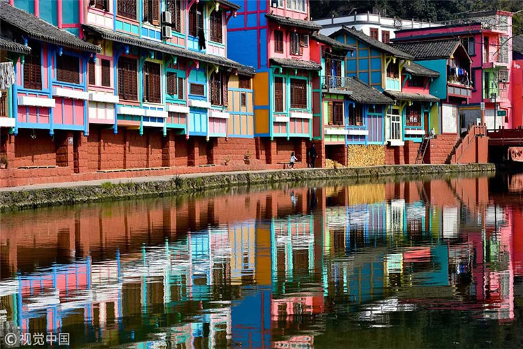 Una colorida ciudad como la isla de Burano en Venecia se encuentra dentro de las montañas del condado de Qionglai en Chengdu, provincia de Sichuan, al suroeste de China, el 18 de febrero de 2016.