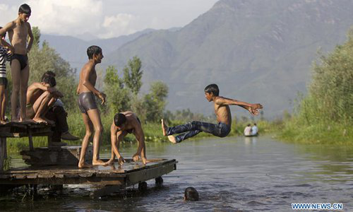 Un niño salta al lago Dal en Srinagar, la capital de verano de India, el 2 de agosto de 2018.