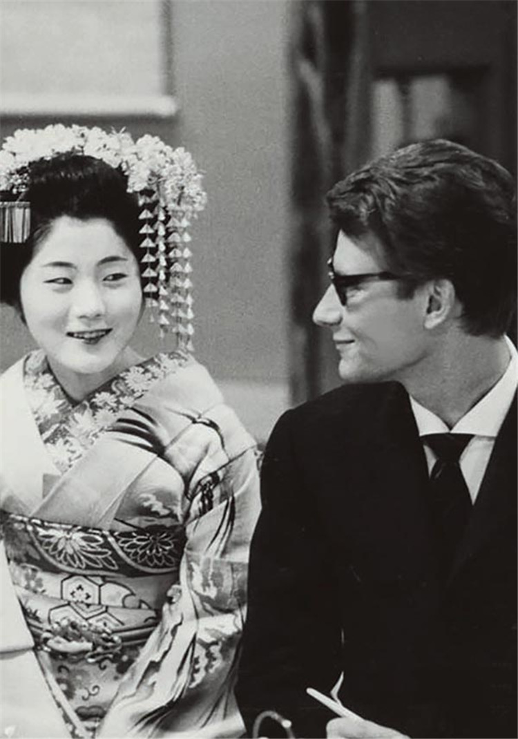 Yves Saint Laurent y una cortesana vistiendo atuendos tradicionales durante el primer viaje del diseñador a Kyoto, Japón en 1963.