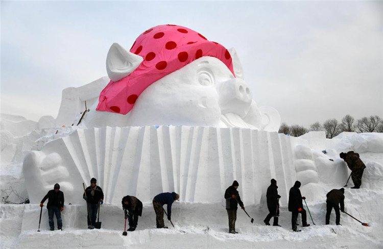 Trabajadores dando los toques finales a la figura de un cerdo en la 31° Exposición Internacional de Arte de Esculturas de Hielo de Harbin, en Harbin, noreste de China. 12 de diciembre de 2018.