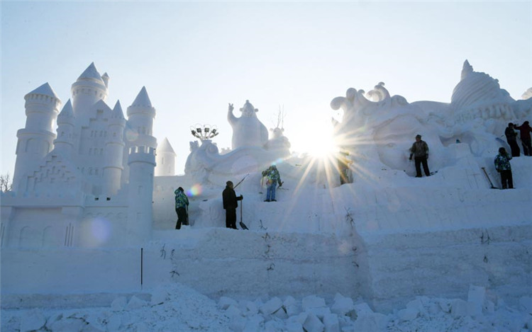 Artistas trabajando en algunas esculturas de nieve en Harbin, noreste de China. 14 de diciembre de 2018.
