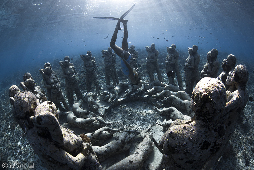 Esta fotografía de Sam Lawrence retrata 48 figuras en tamaño real sumidas en un abrazo. Con el tiempo, se espera que estas esculturas se conviertan en arrecifes de corales artificiales.