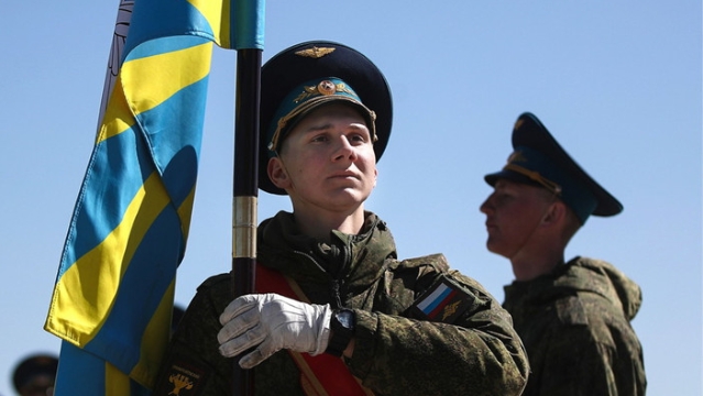 Soldados rusos durante un ensayo para el desfile militar que marca el 74 aniversario de la Victoria sobre la Alemania nazi en la Gran Guerra Patria de 1941-45, el Frente Oriental de la Segunda Guerra Mundial, en el campo de entrenamiento de Alabino en Moscú, Rusia, 17 de abril de 2019