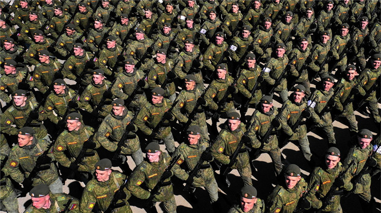 Militares durante un ensayo para el desfile militar que marca el 74 aniversario de la Victoria sobre la Alemania nazi en la Gran Guerra Patria de 1941-45, el Frente Oriental de la Segunda Guerra Mundial, en Moscú, Rusia, 17 de abril de 2019.
